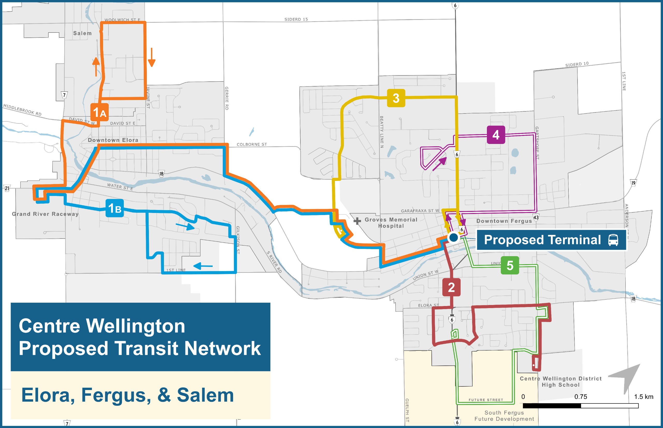 - Route 1A Elora to Salem, and Route 1B Elora to Gilkison, operating between the proposed terminal in Fergus and the north or south areas of Elora, respectively.
